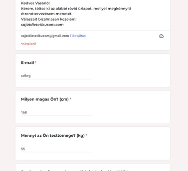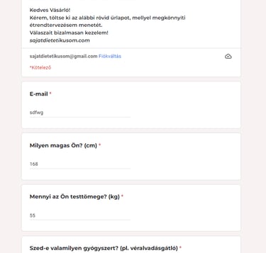 Első lépésként felmérem az egyén testalkatát, étkezési szokásait. Ezt szakszóval táplálkozási anamnézisnek nevezzük. A megrendelő e-mail címére megkapja az általam összeállított rövidített táplálkozási anamnézist, mely elemzésével megkezdhetem az egyénre szabott étrendtervezést. Az űrlap kitöltése nagyjából 5-10 percet vesz igénybe.